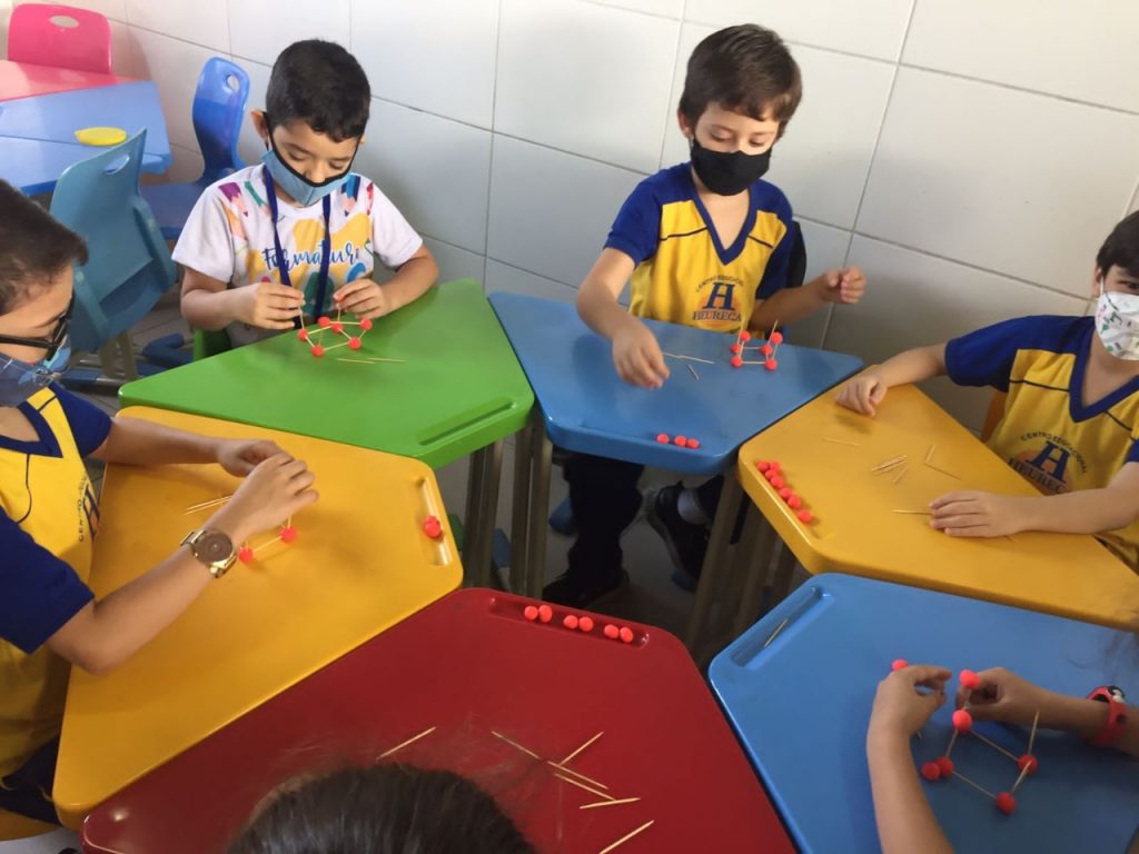 A turma do 2º ano teve uma aula especial de Matemática com a professora Heloísa Syane. Os alunos trabalharam na prática a construção dos sólidos geométricos cubo e pirâmide. Na aula, foram trabalhados os conceitos de lados, arestas e vértices. ☺️